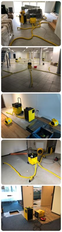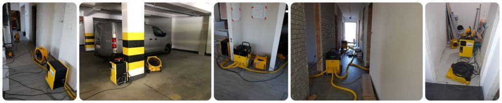 Najczęściej stosujemy osuszacze kondensacyjne w połączeniu z wentylatorami, które zużywają niewielką ilość prądu i są najefektywniejsze w procesie osuszania tego rodzaju szkód. Osuszacze odbierają nadmiar wilgoci z powietrza obniżając wilgotność do około 30%, a wentylatory przyśpieszają proces suszenia. W wyniku styczności mokrych materiałów z suchym powietrzem, zgromadzona w nich wilgoć odparowuje w przyspieszony, lecz całkowicie naturalny sposób. Do osuszania nie używa się wysokiej temperatury, lecz suchego powietrza, co eliminuje ryzyko uszkodzenia osuszanych materiałów.