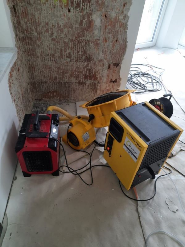 Jeżeli mokra ściana nie jest pomalowana, bo np. zalaniu uległo mieszkanie w stanie deweloperskim to po pomiarze zawilgocenia i obliczeniu kubatury pomieszczenia wstawiamy odpowiednią ilość osuszaczy i wentylatorów pamiętając równocześnie o zachowaniu optymalnej temperatury do osuszania pomieszczenia. Dodatkowo pomocne mogą okazać się nagrzewnice i panele na podczerwień.